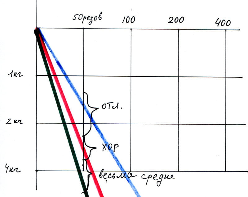Итак, первое: все ножи можно по отзывам потребителей, поделить на три категории: отличные, хорошие, плохие. Эти субъективные оценки имеют четко выраженное арифметическое значение. Важна цифра, с каким давлением нож перерезает контрольный шнурок, после того, как он сделал 50 резов на канате 37мм. Это открытие и установление точных пределов - полностью заслуга нашего заточника и статистика И.Лукинова. Благодаря наличию волшебной записной книжки и скрупулезному ее заполнению, он и вывел эти точные границы.