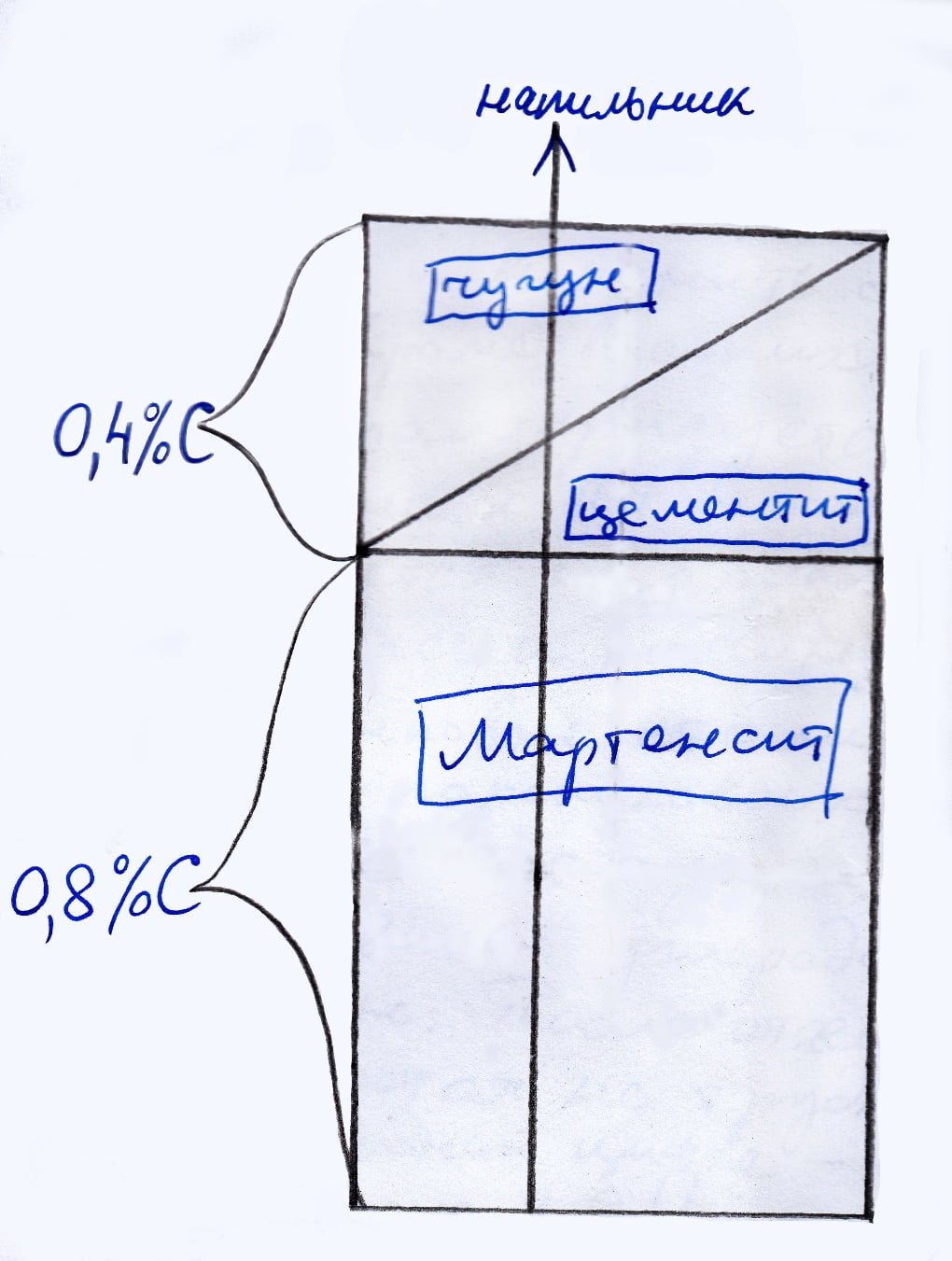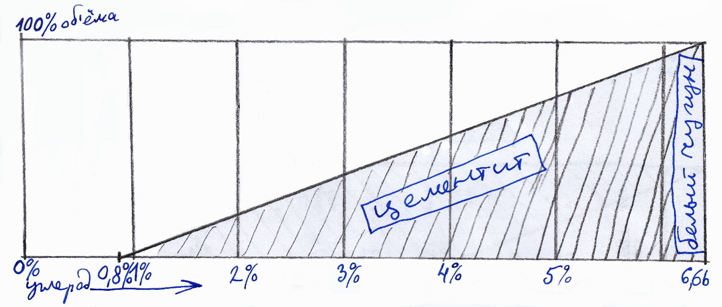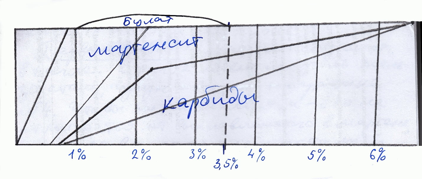 Булат — двухкомпонентен: перлит плюс карбиды. А на графике, практически во всем диапазоне — трехкомпонентная схема: перлит + чугун + карбиды. Если вы захотите точку в 1,2%С, восстановите вертикаль и посмотрите: далее я цитирую по учебнику Гуляева А.П.: «Твердость напильника обычно 64 ед….67 ед.HRC. Его состав: 2%…3% - цементит, 20% - чугун, остальное — мартенсит».