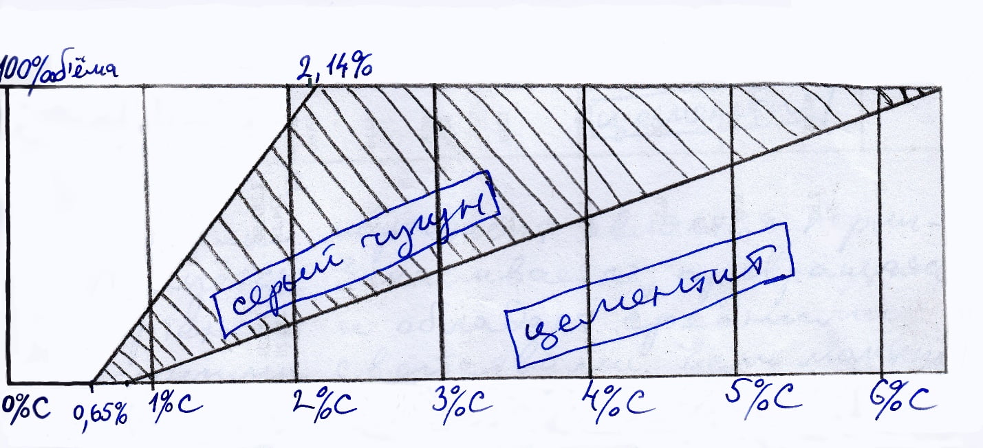 Мелким ситом первые молекулы остаточного аустенита отлавливаются уже при уровне 0,65%С. Далее плавное нарастание и при 2,14%С мы имеем 100% серый чугун.
