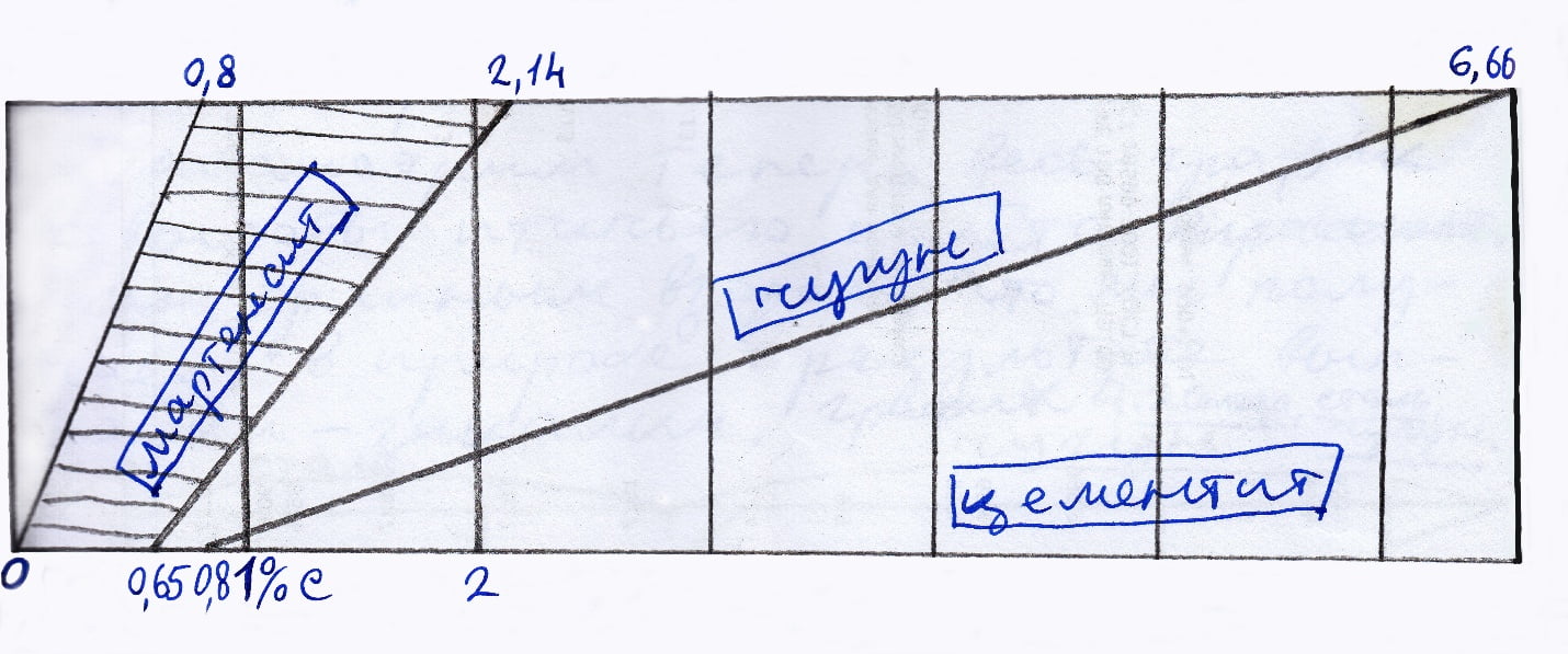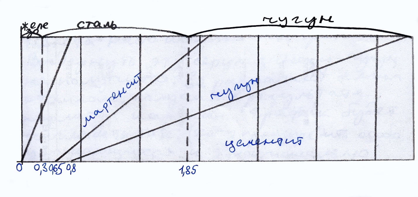 Первый диапазон от 0%С до 0,3%С — железо: куется, не закаливается, не режет.